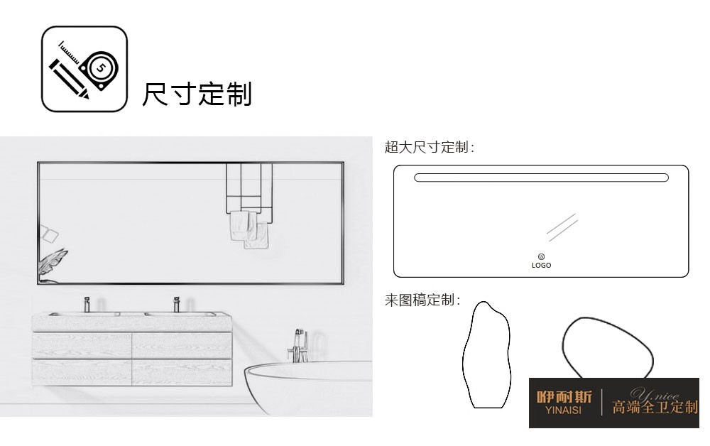 作為個性化的時代,現在的消費者再也不是曾經廠家生產什么就買什么了。現在很多消費者對于浴室鏡,就提出了很多個性化的定制需求。作為專業的浴室鏡廠家,咿耐斯提供完整的定制化設計。下面,小編從尺寸定制、形狀定制、風格定制、功能定制4個方面來簡單說說智能浴室鏡的專業定制,詳情如下: