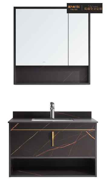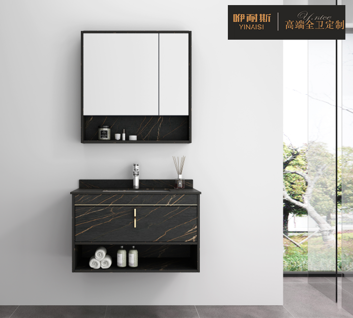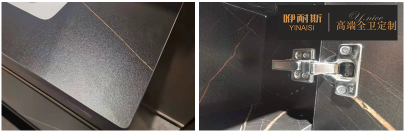 這一點,咿耐斯衛浴柜廠家最新推出的酒店風浴室柜,就完全符合當下市場流行趨勢及用戶的審美需求。在顏色上,浴室柜主要采用了勞倫黑金經典色,黑金表層一體式的仿石紋理,將巖板的高冷和實木的溫暖感完美結合,既時尚又大氣,盡顯都市氣質。材質方面,則優選多層實木板為主材,加上面漆處理工藝,令產品不僅具有很好的耐腐蝕、耐刮磨、防火耐高溫性能,且不吸污,易清潔,有臟污濕毛巾擦拭即可清理干凈,非常便捷。