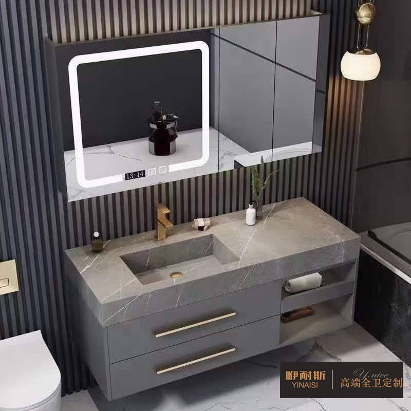 2、巖板浴室柜看起來十分美觀,質感細膩,在燈光的照耀下超顯檔次。
